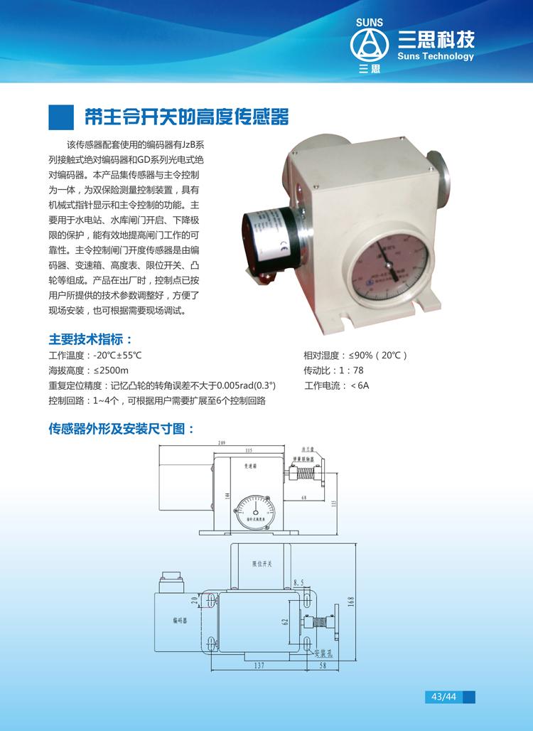 該傳感器配套使用的編碼器有JzB系列接觸式絕對編碼器和GD系列光電式絕對編碼器。本產(chǎn)品集傳感器與主令控制為一體,為雙保險測量控制裝置,具有機(jī)械式指針顯示和主令控制的功能。主要用于水電站、水庫閘門開啟、下降極限的保護(hù),能有效地提高閘門工作的可靠性。主令控制閘門開度傳感器是由編碼器、變速箱、高度表、限位開關(guān)、凸輪等組成。產(chǎn)品在出廠時,控制點(diǎn)已按用戶所提供的技術(shù)參數(shù)調(diào)整好,方便了現(xiàn)場安裝,也可根據(jù)需要現(xiàn)場調(diào)試。