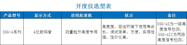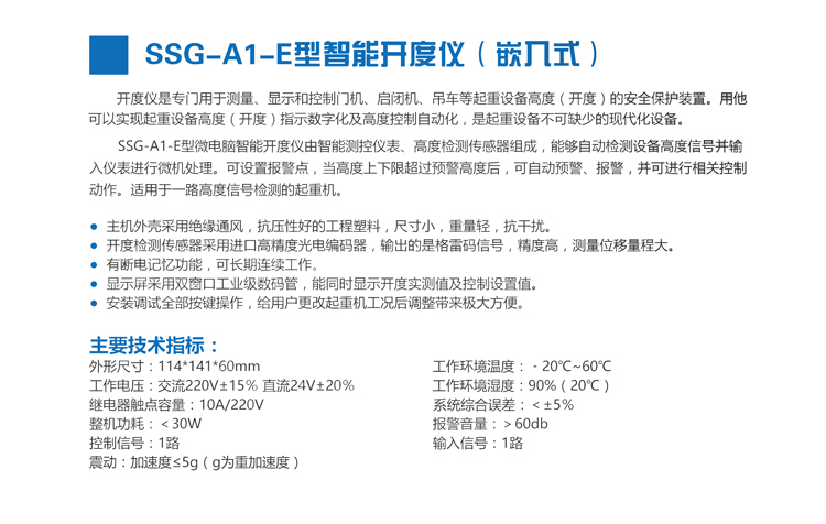SSG-AⅠ-E型微電腦智能開度儀由智能測(cè)控儀表、高度檢測(cè)傳感器組成,能夠自動(dòng)檢測(cè)設(shè)備高度信號(hào)并輸入儀表進(jìn)行微機(jī)處理??稍O(shè)置報(bào)警點(diǎn),當(dāng)高度上下限超過(guò)預(yù)警高度后,可自動(dòng)預(yù)警、報(bào)警,并可進(jìn)行相關(guān)控制動(dòng)作。適用于一路高度信號(hào)檢測(cè)的起重機(jī)。