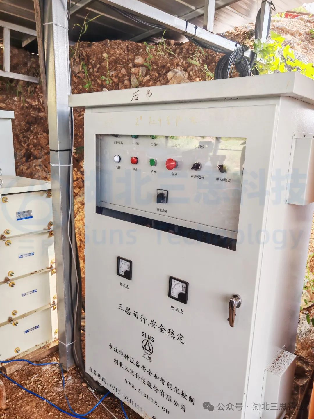 ▲電氣柜安裝完工展示。電氣柜中安裝有PLC,電氣柜上安裝啟動(dòng)停止按鈕,并且安裝電壓表以及電流表方便集中控制。