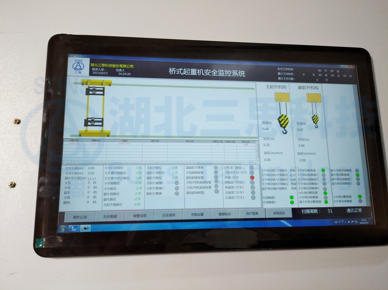 系統(tǒng)實(shí)時(shí)報(bào)警畫(huà)面及歷史報(bào)警畫(huà)面,記錄起重機(jī)運(yùn)行過(guò)程中的各種故障報(bào)警和設(shè)置報(bào)警,如:超載報(bào)警,門(mén)限位報(bào)警,主副鉤上限報(bào)警,天車行程報(bào)警,限位報(bào)警等,并且在故障發(fā)生時(shí)發(fā)出聲光報(bào)警,以及及時(shí)提醒駕駛員。